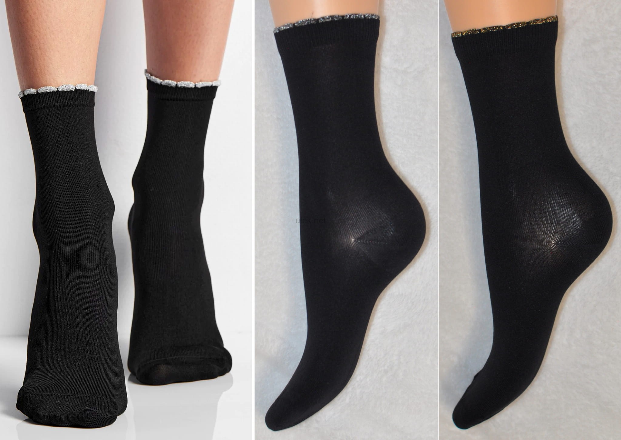Dostępne w kolorach : czarne z srebrną nitką (nero-argento), czarne ze złotą nitką (nero-oro), czarne z czerwoną błyszczącą nitką (nero-rosso), czarne z czarną błyszczącą nitką (nero-nero)